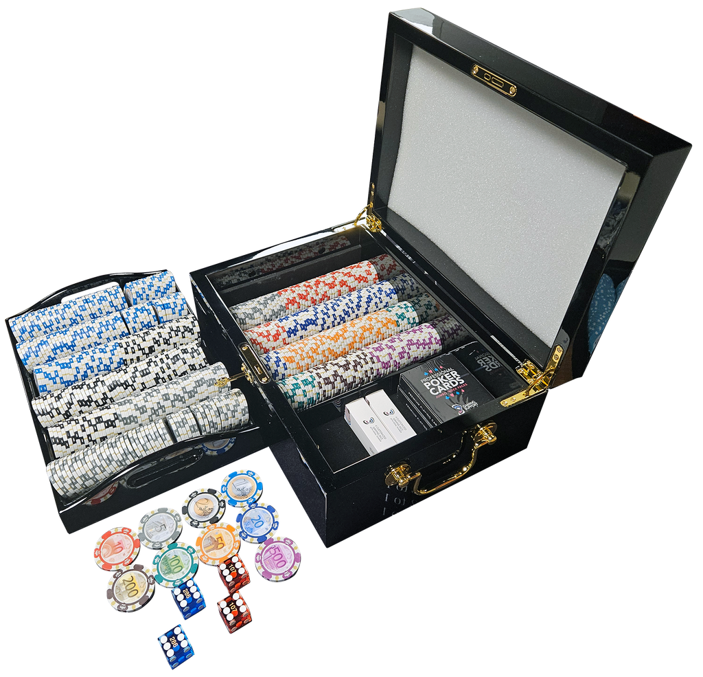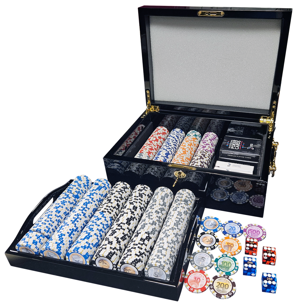 The chips are professional 14-gram ceramic chips measuring 39mm x 3.3mm. The dice are certified and serially numbered. The poker playing cards are of professional synthetic casino quality.